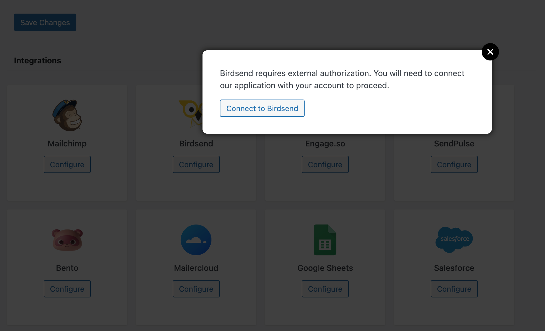 On the configuration modal, click on “Connect to BirdSend”.