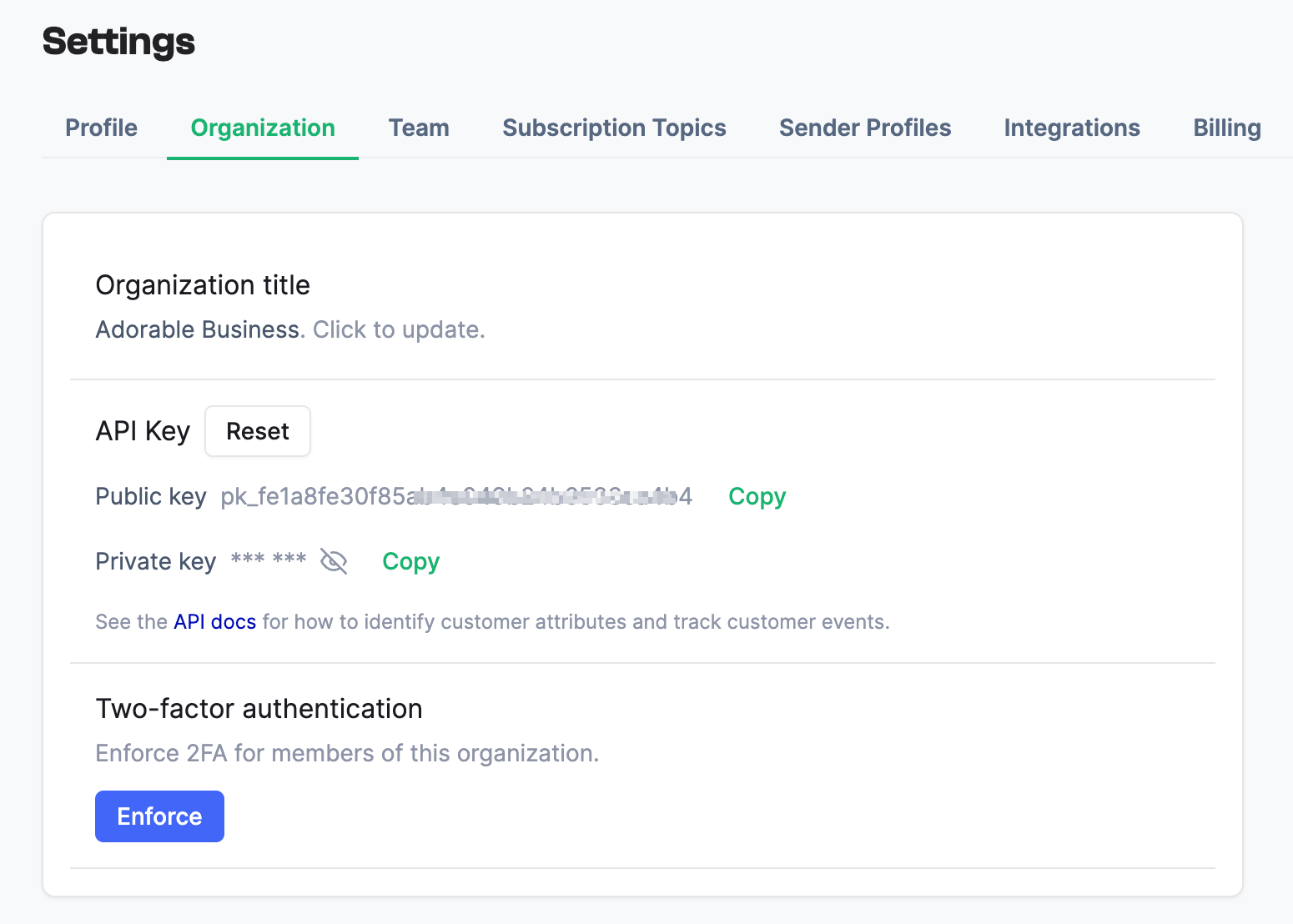 Go to Settings > Organization to see your account public and private keys.