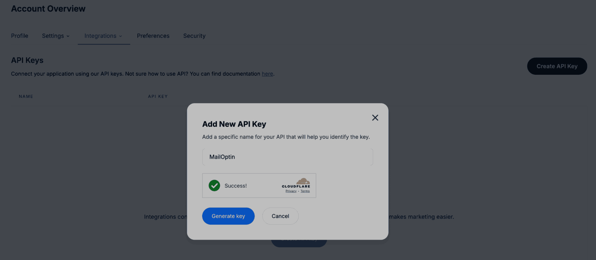 Log in to your account, navigate to Account >> integrations >> API Key, and click the Create API Key button.