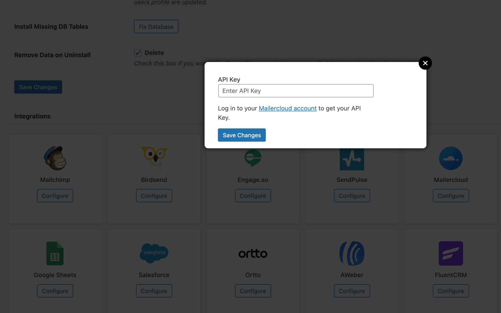 Go to FuseWP >> Settings and click the “Configure” button in the Mailercloud section to reveal the modal settings.