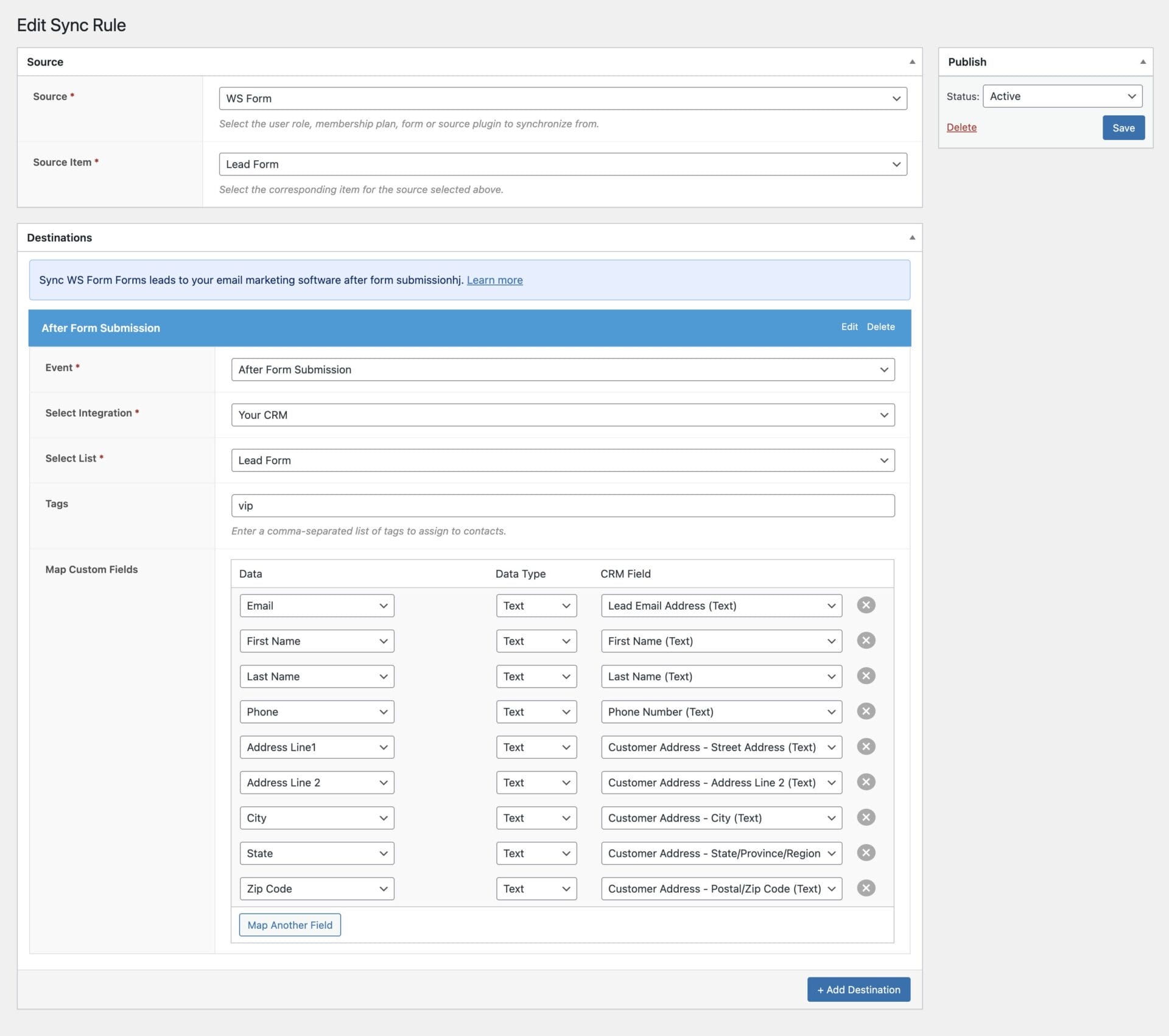 In the screenshot below, users or website visitors who fill out and submit the “Lead Form” will be synced to the selected CRM list and assigned the “VIP” tag.