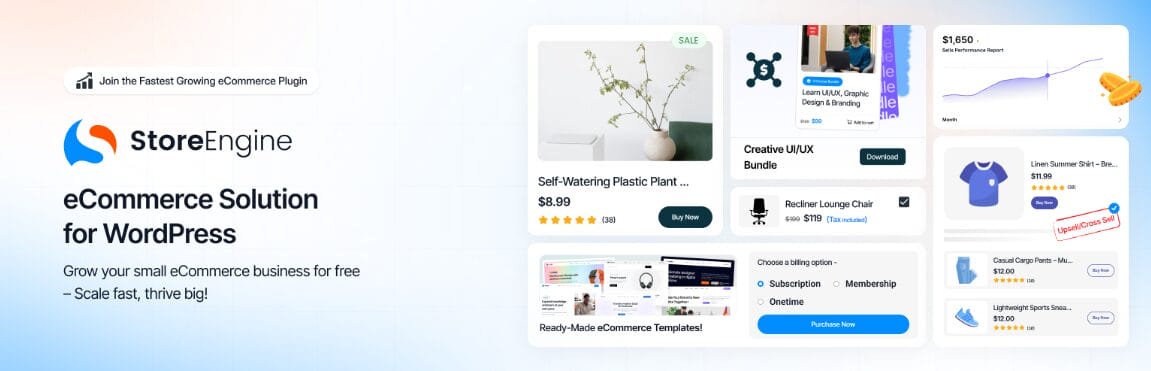 StoreEngine is a powerful option for anyone searching for the best WordPress ecommerce plugin to build and grow an online store without relying on multiple add-ons. It supports digital products, physical goods, subscriptions, memberships, services, and software licenses, all from one dashboard.